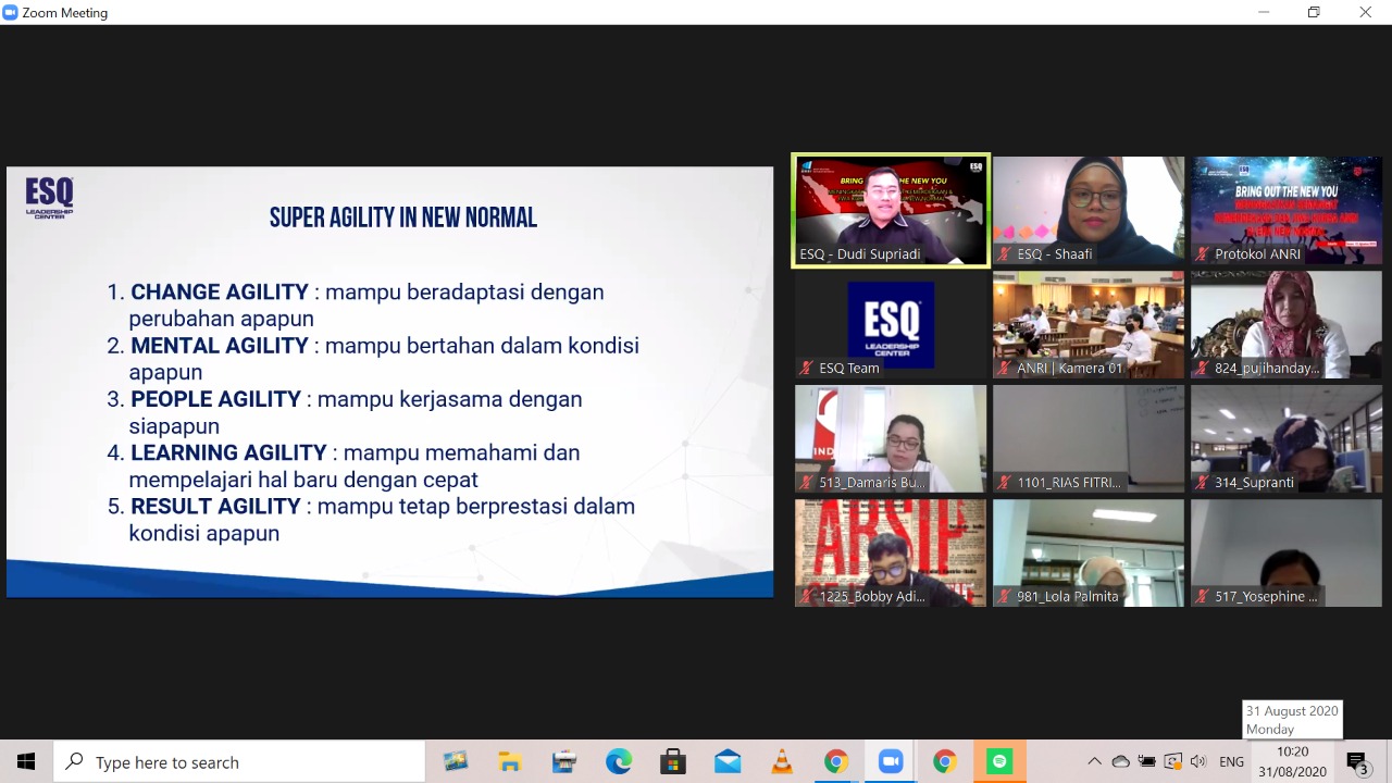 Dalam zoom meeting terlihat bahwa para peserta sangat bersemangat ikuti materi yang dijelaskan oleh para Coach. Ditambah lagi, ratusan peserta ANRI mendapatkan paparan tentang 'Super Agility in New Normal' seperti yang tertera pada gambar berikut: