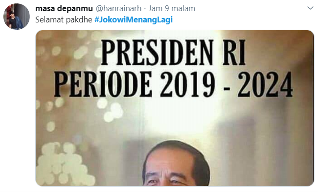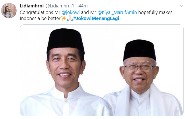 Menurut akun Twitter dengan hastag #JokowiMenangLagi, ramai memberikan ucapan selamat kepada pasangan Jokowi-Maruf Amin yang akan memimpin negara Indonesia ini 5 tahun kedepan.