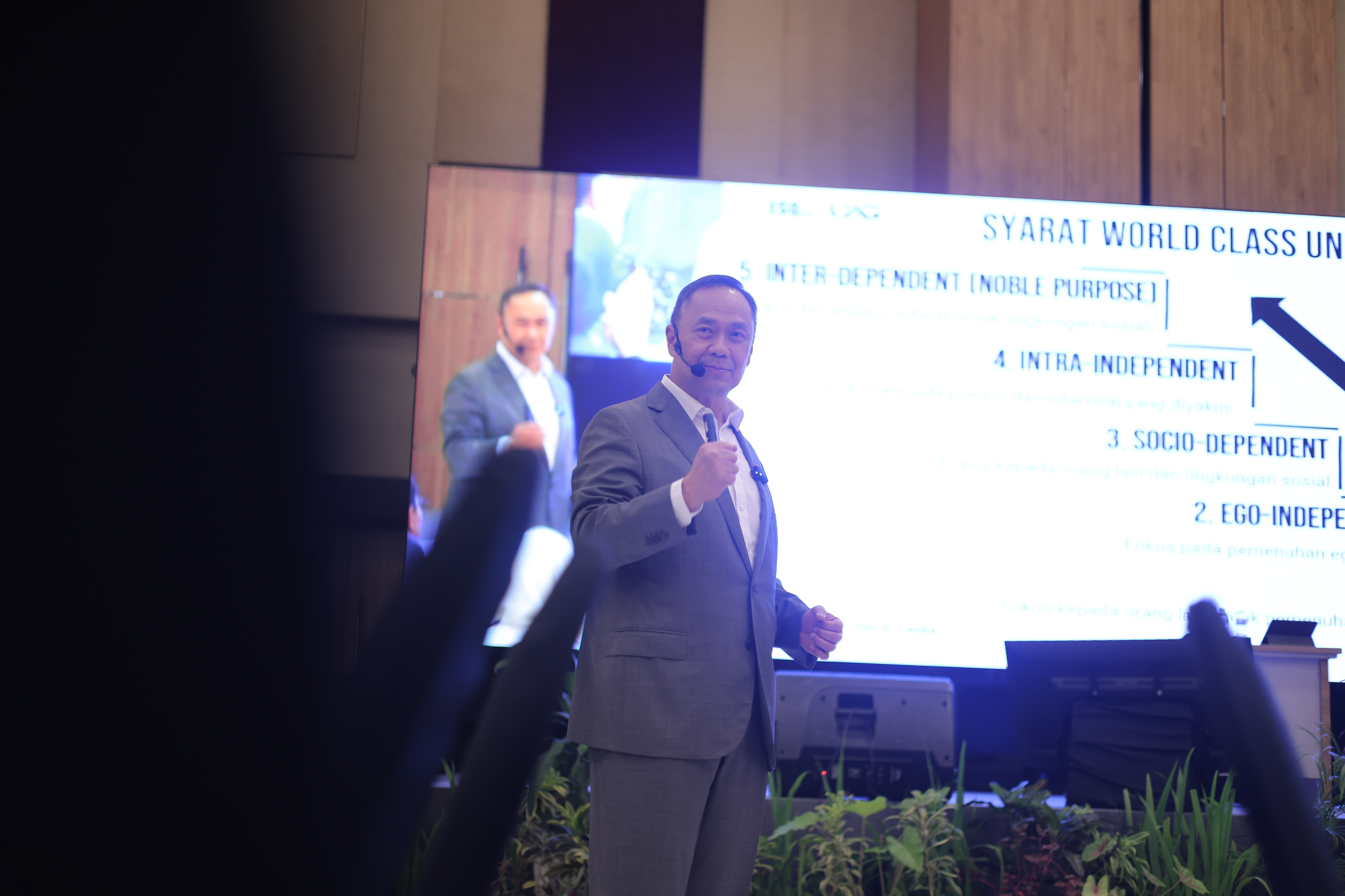 Agar kampus kita juara, saya berikan jurus, hasil studi banding dengan konsep-konsep dunia. Contohnya bagaimana Microsoft sahamnya jatuh, bisa bangkit lagi. Kemudian, bagaimana cara berbagai lembaga-lembaga itu bisa bertahan di kelas dunia. Dan saya praktekkan selama 25 tahun.