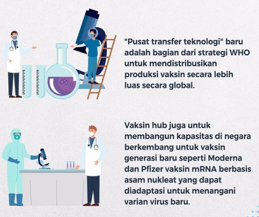 Menurut informasi dari laman Kemenkes RI, sebelumnya WHO telah menunjuk Afrika Selatan sebagai “Pusat transfer teknologi” untuk membantu WHO memperluas distribusi vaksin COVID-19 secara global serta mendorong negara-negara berkembang untuk meningkatkan kapasitas pembuatan vaksin platform mRNA, yang dinilai bisa cepat beradaptasi dalam mengatasi varian baru COVID-19.