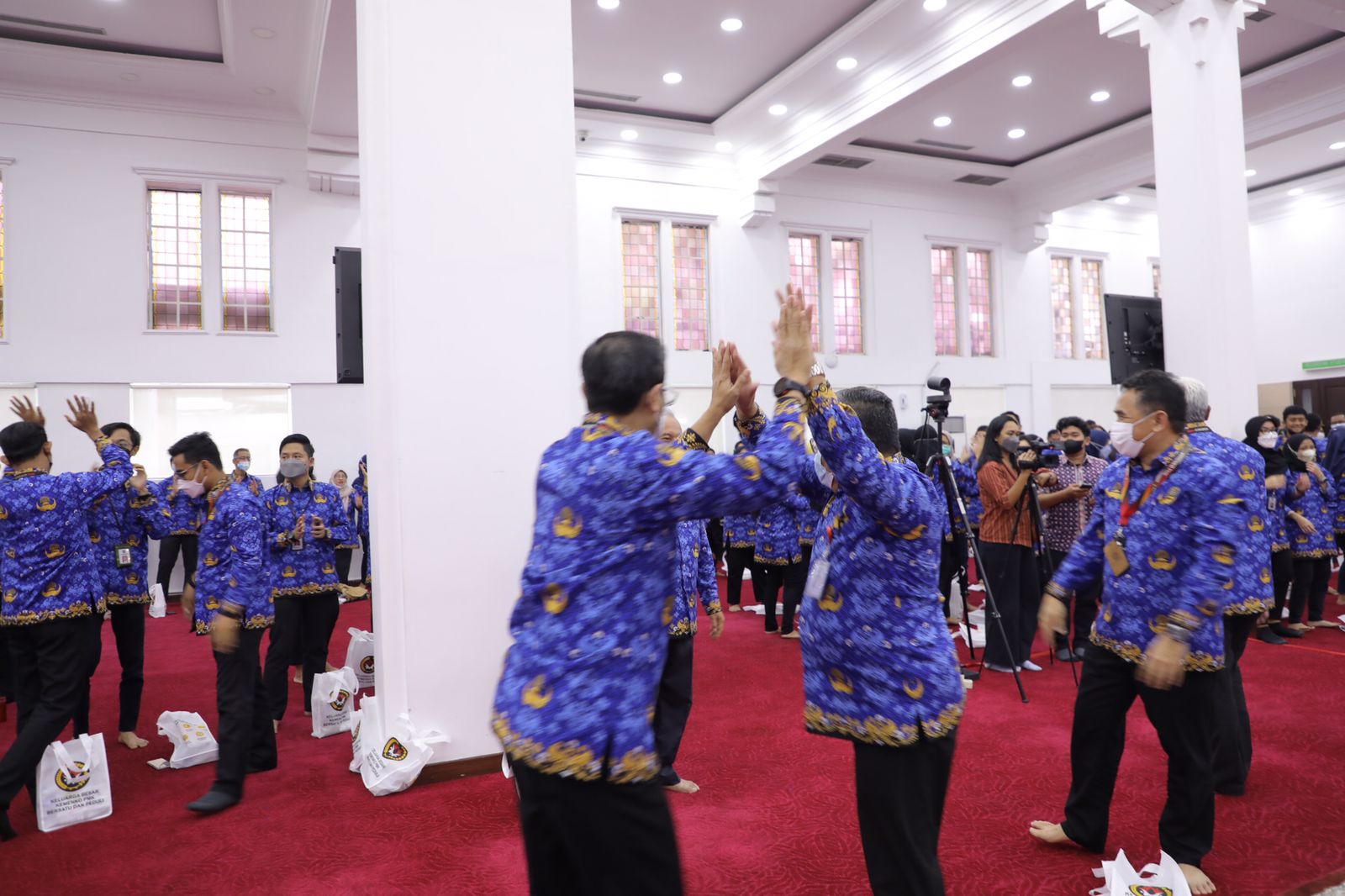 Aris ditemani oleh Para Pejabat Kemenko PMK, Seluruh pegawai Kemenko PMK yang 50% nya adalah kaum milenials. Sebagai info, Kemenko PMK ini membawahi 7 Kementerian, 12 Lembaga dan Badan.