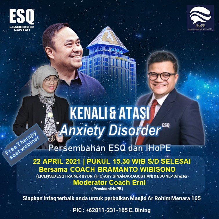 Untuk itu, hadir Webinar Kenali & Atasi Anxiety disorder yang di gagas oleh IHoPE (Ikatan Hypnotherapis dan NLPer ESQ) bekerjasama dengan ESQ Leadership Center, dan akan ada Free Healing Session saat Webinar. Berikut informasinya: