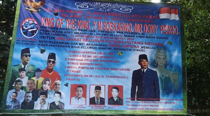 Isi spanduknya yaitu "Allahu Akbar, Allahu Akbar, Allahu Akbar. Selamat Datang di Kota Tangerang King of The King. YM Soekarno, Mr Dony Pedro. Presiden Direktur Bank UBS, Presiden PBB, Presiden MI. Pembukaan Aset Amanah Allah SWT Allahu Akbar Yang Maha Agung Pada Tanggal 25 November 2019 s/d 30 Maret 2020 untuk: Melunasi Seluruh Hutang-Hutang Negara, Menyelesaikan dan Melaksanakan Dana Ampera, Menuju Kesejahteraan Bagi Seluruh Rakyat Indonesia (KNKRI)".
