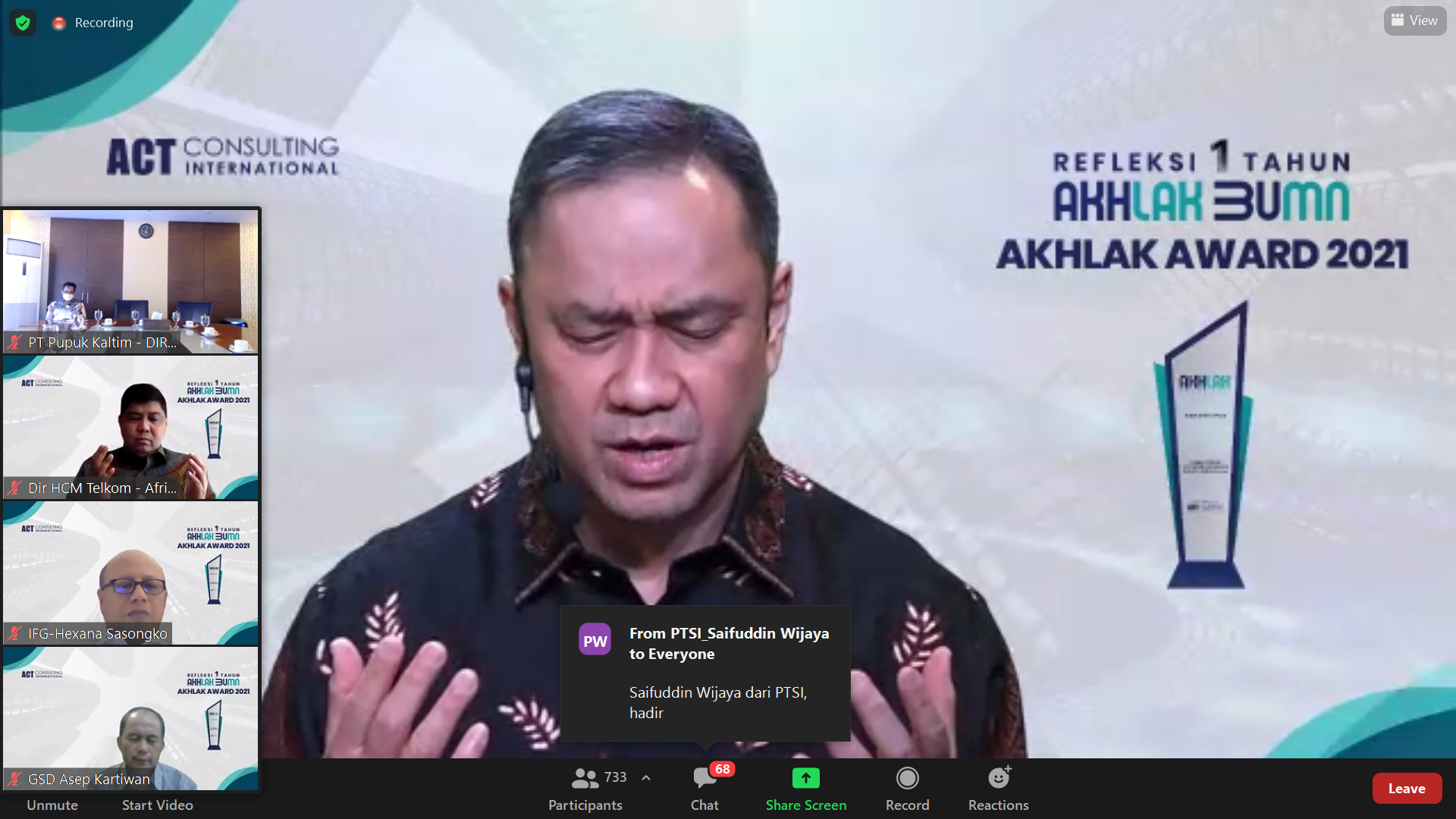 Tahun AKHLAK BUMN dan AKHLAK Award 2021” pada Kamis (15/7/2021) via zoom