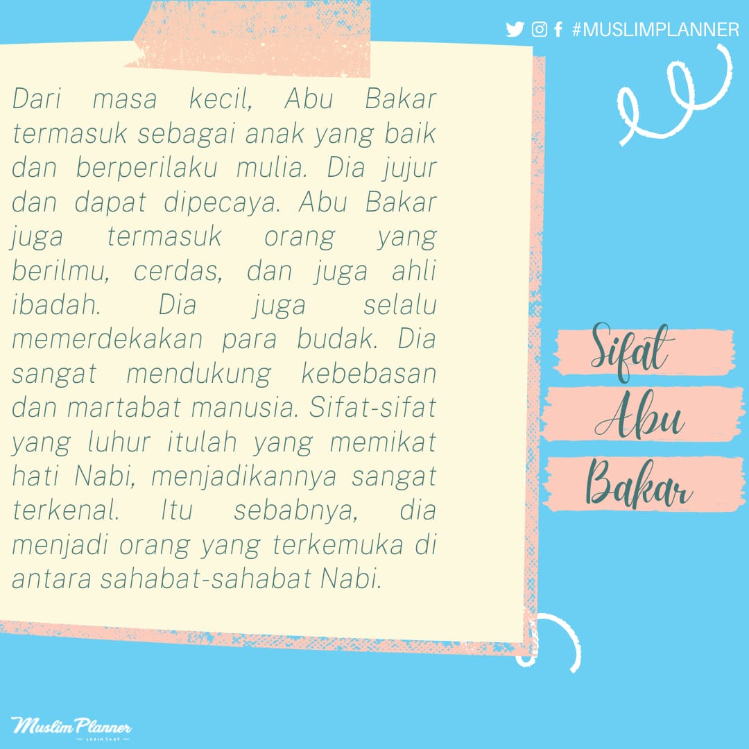 Abu Bakar adalah salah satu sahabat Nabi, dengan nama asli menurut Muslim Planners yakni Abdullah bin Ustman. Sedangkan nama shiddiq diberikan kepadanya karena Abu Bakar memiliki sifat benar, yaitu membenarkan apapun yang dilakukan oleh Nabi Muhammad.