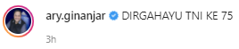 CEO ESQ Group, Dr. (H.C) Ary Ginanjar Agustian turut mengucapkan “DIRGAHAYU TNI KE 75” pada Instagram pribadinya @ary.ginanjar.