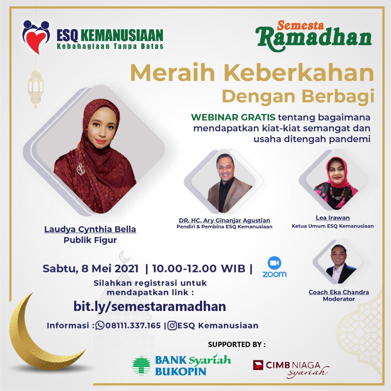 ESQ Kemanusiaan menyiapkan webinar bertajuk "Meraih Keberkahan dengan Berbagi" dengan inspirator yang akan memberikan motivasi dan inspirasi kepada khalayak di tengah pandemi.