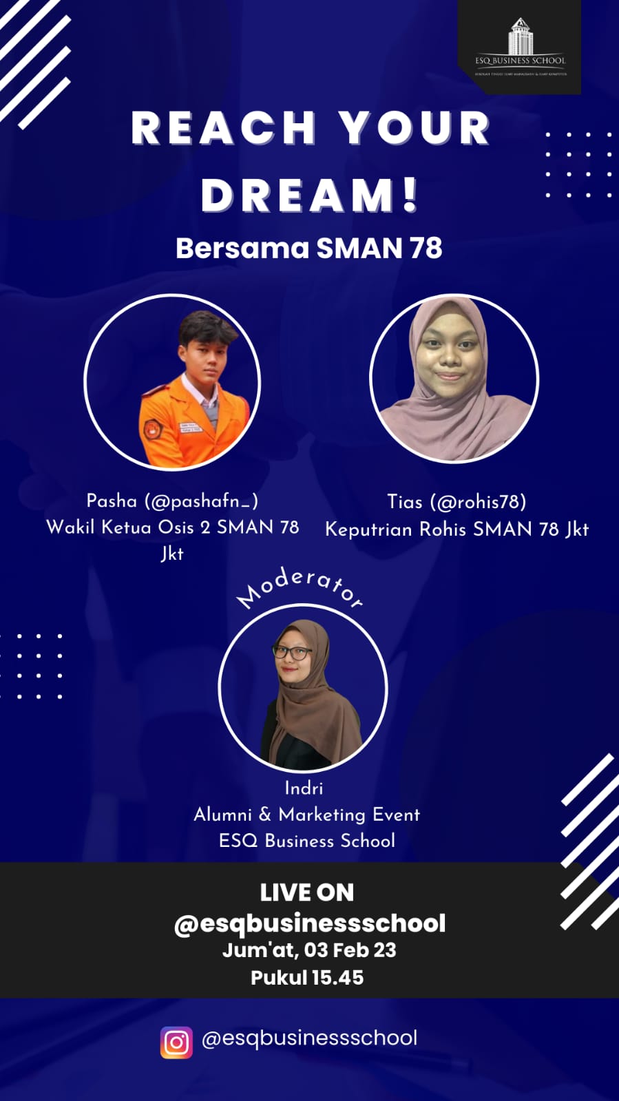 Program baru ESQ Business School mengadakan live instagram bersama siswa/siswi SMA dengan judul "Reach Your Dream", dan kali ini hadir Muhammad Pasha seorang Wakil Ketua OSIS SMAN 78 yang membagikan kegiatannya sebagai siswa SMA 78 Jakarta.