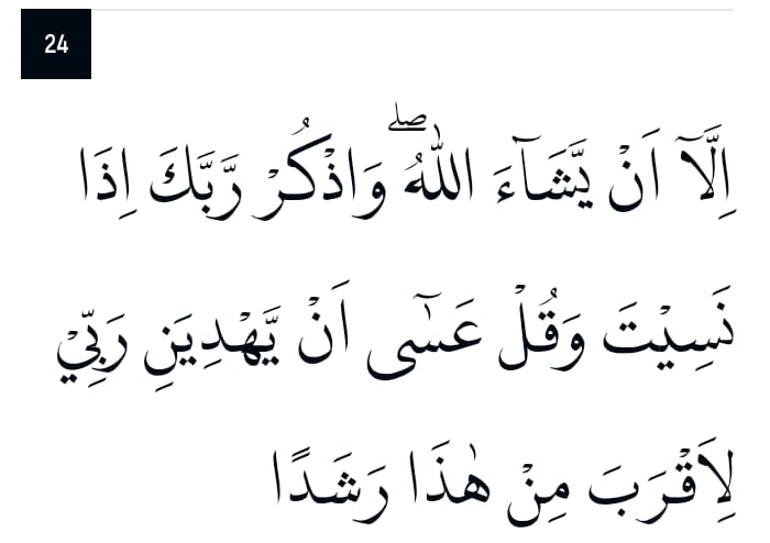 "Dan jangan sekali-kali engkau mengatakan terhadap sesuatu: 'Sesungguhnya aku akan mengerjakan itu besok pagi, kecuali (dengan menyebut), Insyaa Allah. Dan ingatlah kepada Tuhanmu, apabila engkau lupa dan katakanlah, “Mudah-mudahan Tuhanku akan memberiku petunjuk kepadaku agar aku yang lebih dekat (kebenarannya) daripada ini.” (QS. Al Kahfi: 23-24)