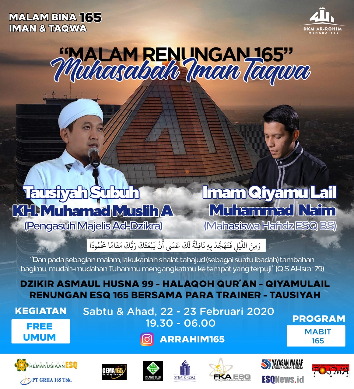 Acara Mabit ini juga didukung oleh Direktur Grha 165 Lea Irawan, Ketua Wakaf 165 Hariyo Puguh, LK ESQ, LDK dan mahasiswa ESQ Business School, para alumni ESQ; FKA ESQ 165, GEMA 165 dan Fosma 165.