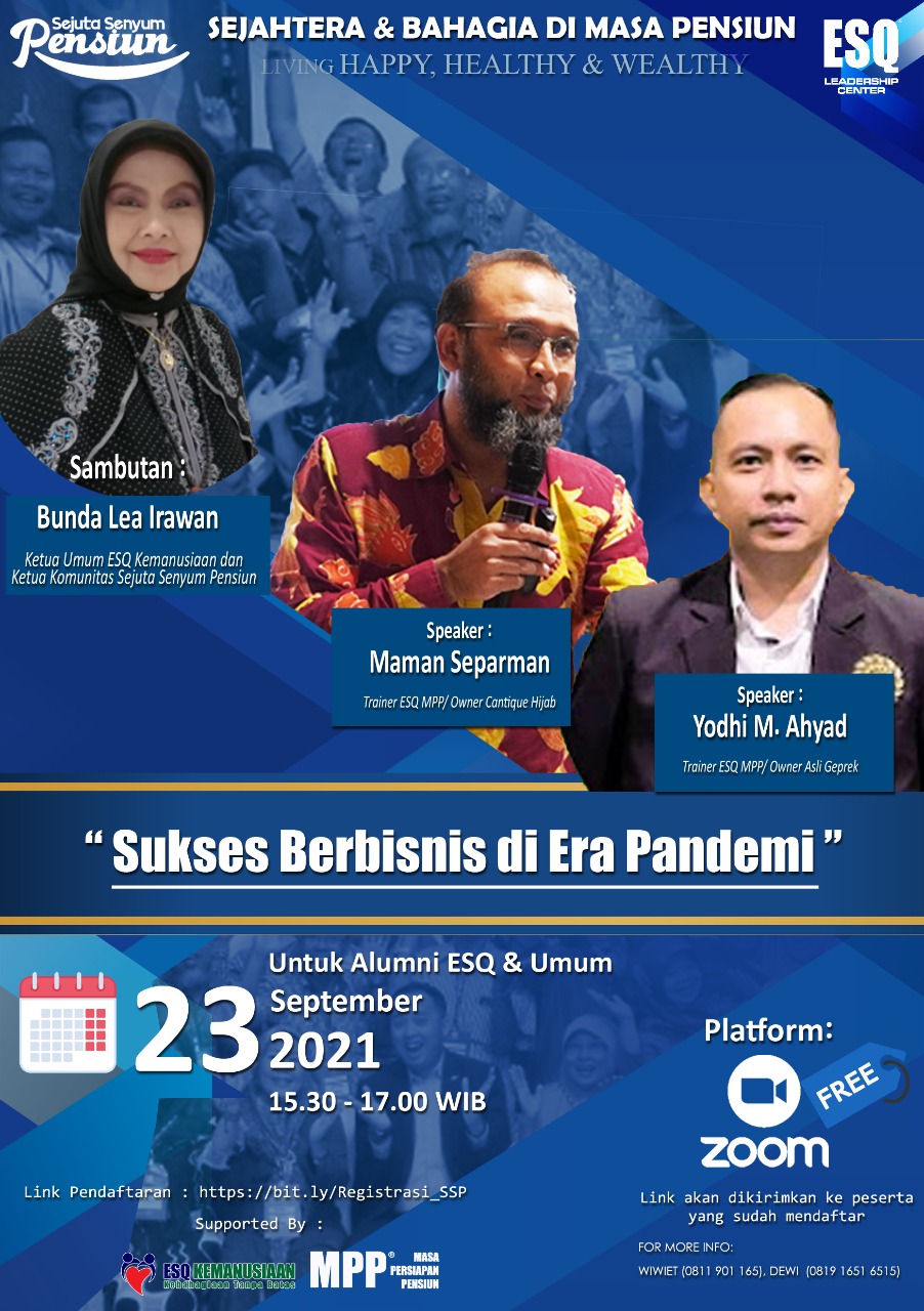 ESQNews.id, JAKARTA - ESQ Masa Persiapan Pensiun (ESQ MPP) mempunyai komunitas yaitu Komunitas SEJUTA SENYUM PENSIUN (SSP). Komunitas ini mempersembahkan acara FREE Seminar Online dengan mengusung tema “Memulai Bisnis di Era Pandemi.”