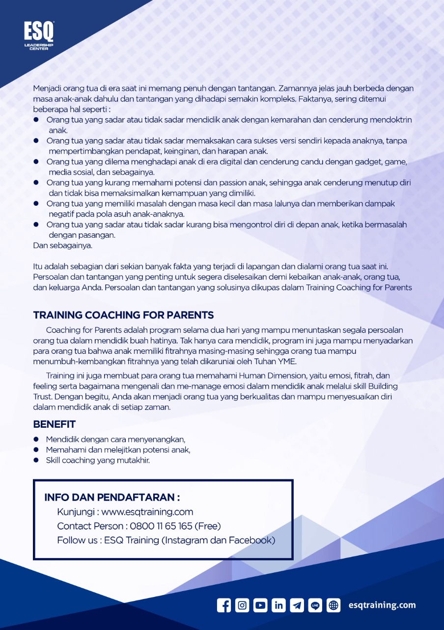 Training Practical Coaching for Parents adalah sebuah metode coaching yang mampu atasi setiap persoalan yang dialami orang tua. Melalui training ini, Anda akan mampu mendidik, mengarahkan, dan menuntun buah hati untuk bisa meraih impian yang diinginkannya.