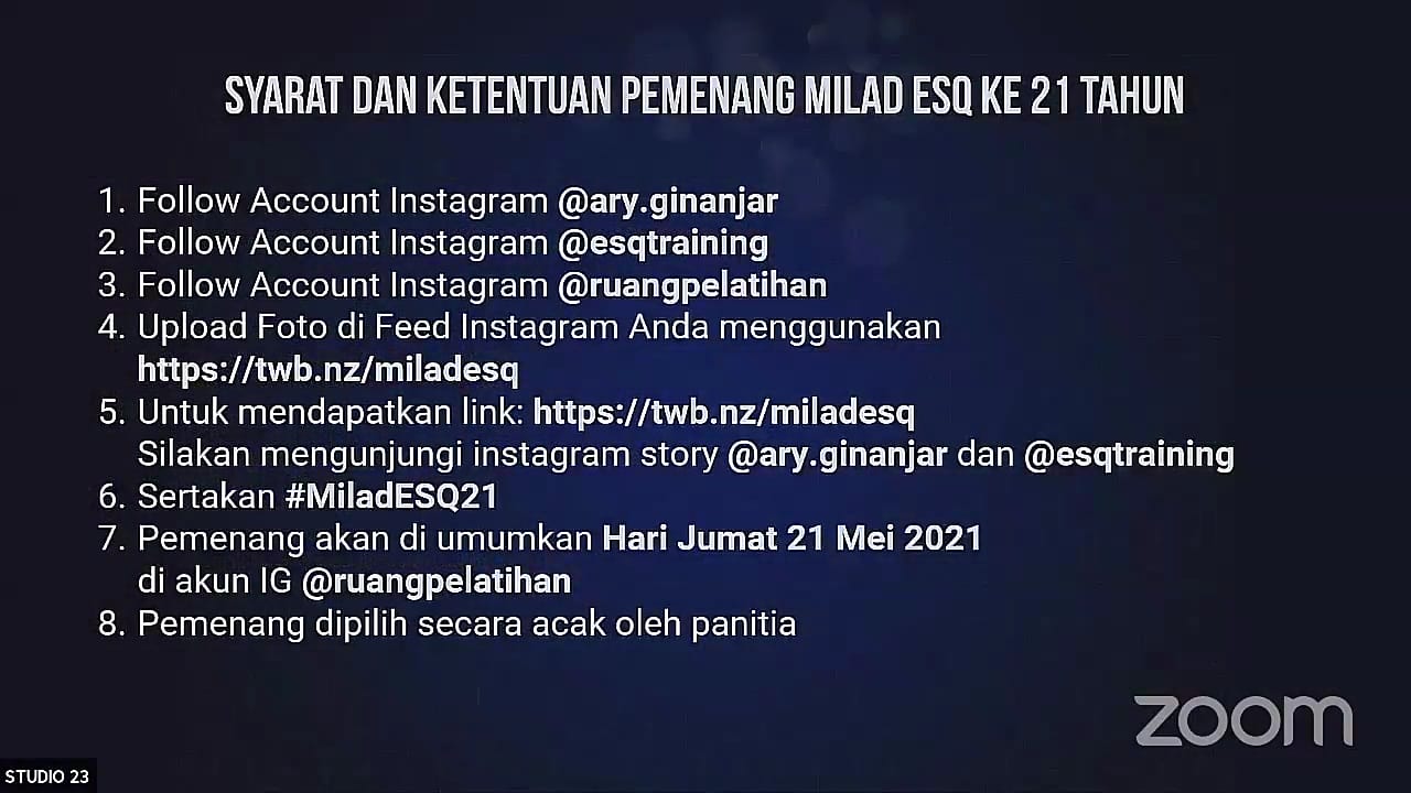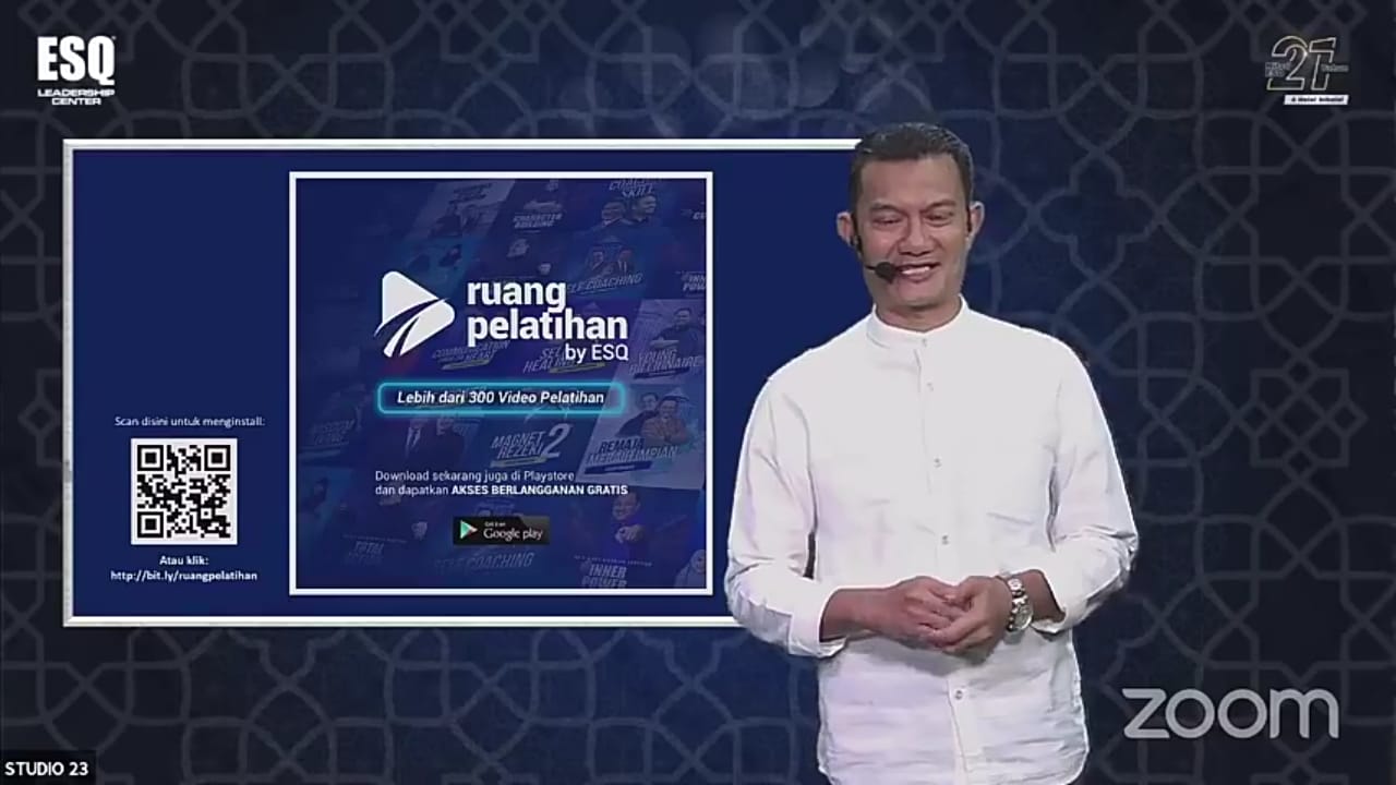 “Terimakasih untuk semuanya yang hadir di sini atas waktunya, yang sudah menyempatkan diri untuk mengikuti acara Milad ESQ ke-21 ini. Terimakasih untuk para Korwil, alumni ESQ, Badan Pengurus ESQ yang ikut bergabung malam hari ini. InsyaAllah persahabatan kita tak hanya di dunia saja namun sampai akhirat,” sapa Ary kepada warganet yang hadir dengan senyuman simetrisnya.
