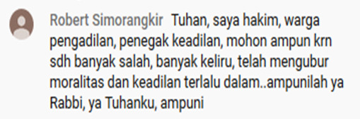 Pria bernama Robert Simorangkir itu mengatakan, “Tuhan, saya Hakim. Warga pengadilan, penegak keadilan. Mohon ampun karena sudah banyak salah, banyak keliru. Telah mengubur moralitas dan keadilan terlalu dalam. Ampunilah ya Rabbi, ya Tuhanku, ampuni.”