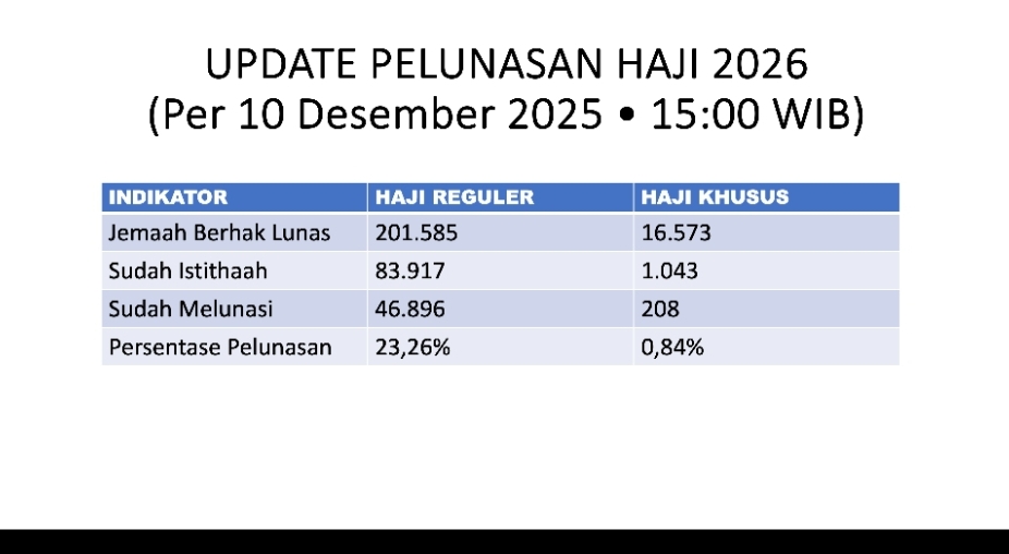 ESQNews.id, JAKARTA - Menjelang batas akhir pelunasan Biaya Perjalanan Ibadah Haji (Bipih) tahun keberangkatan 1447 H/2026 M, data terbaru menunjukkan bahwa proses penyelesaian pelunasan untuk jemaah Haji Reguler maupun Haji Khusus masih bergerak lambat.