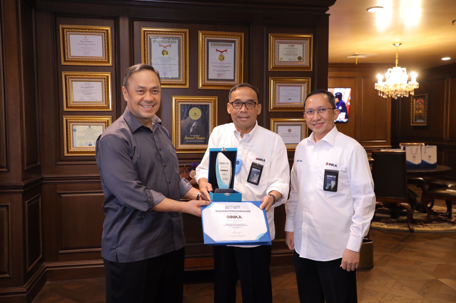 “Atas nama PT Inka kami ucapkan terimakasih kepada ACT Consulting. Ini pertama kali kami meraih penghargaan di AKHLAK Award. Sesuatu yang luar biasa bagi kami,” kata Budi sambil menerima dan memegang Piala serta Piagam kategori indeks implementasi AKHLAK BUMN Klaster Jasa Logistik dari Ary Ginanjar.