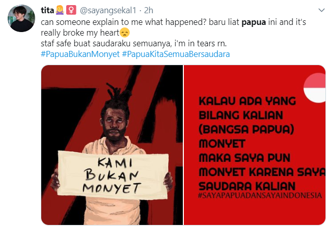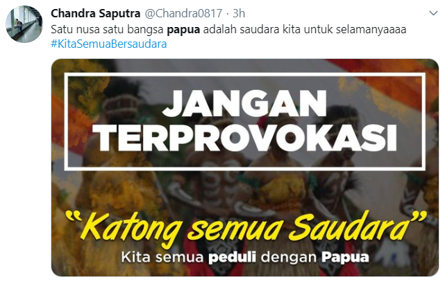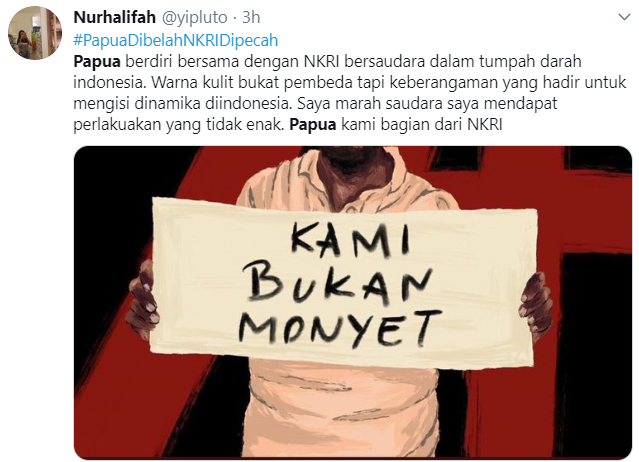 Mengundang rasa geram para warganet dari akun Twitter. Warganet dari berbagai suku bangsa memberikan support kepada warga Papua dan mahasiswa Papua khususnya yang sedang merantau di pulau sebrang.