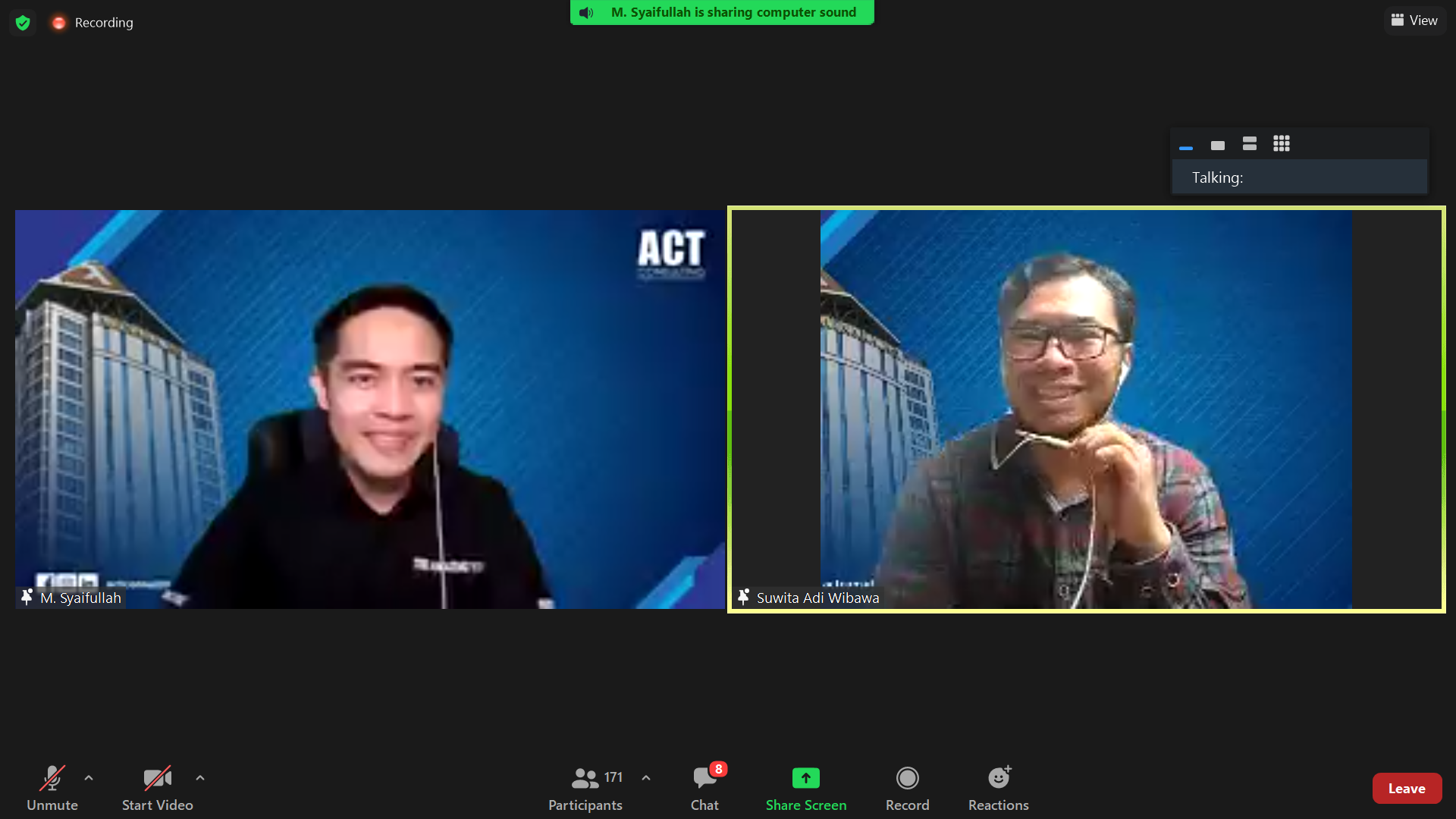 Ia juga menambahkan dengan sangat antusias bahwa, “Training di ACT Consulting ini sangat lugas, membuka pikiran saya. Apa yang disampaikan oleh Coach Amin dan ACT ini luar biasa. Setelah mengikuti 1 sesi, sesi berikutnya saya termotivasi untuk mantengin terus hingga akhir. Rasanya agak kurang rela ninggalin materi di setiap sesinya.”