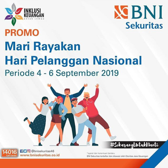 BNI Sekuritas ikut memeriahkan hari jadi 'Hari Pelanggan Nasional' dengan memberikan promo spesial. Selebihnya bisa cek di akun IG @bnisekuritas46! Cek syarat & ketentuannya ya.
