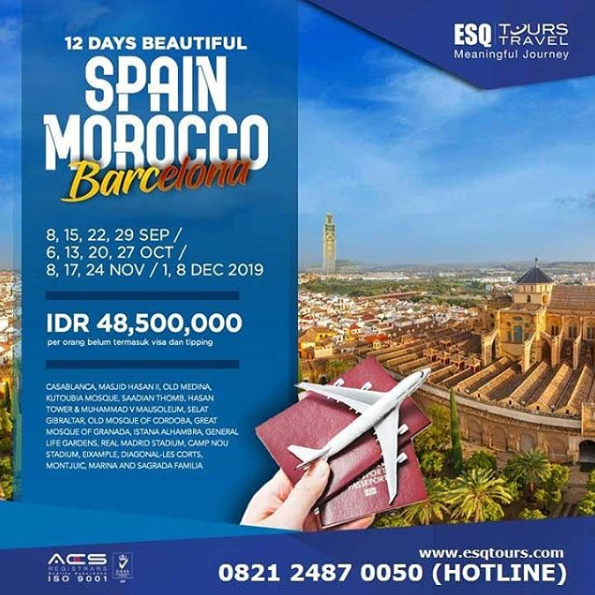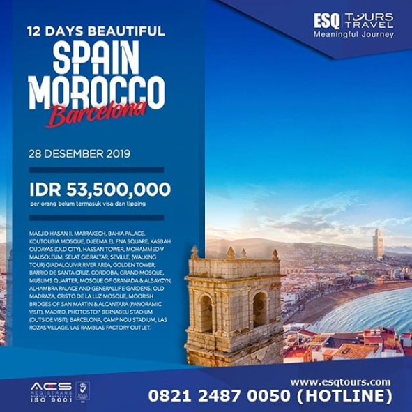 ESQ Tours menawarkan program Golden Civilization, sebuah perjalanan menelusuri jejak keislaman di berbagai belahan dunia. Akan ada perjalanan 12 Days Morocco Spain + Barcelona untuk menilik jejak peradaban Islam di Eropa. Saat itulah, Anda akan menyadari betapa hebatnya Sang Maha Kuasa.