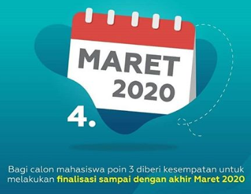 Pendaftaran dapat dilakukan sampai pemilihan Program Studi (prodi) dan Perguruan Tinggi Negeri (PTN), dan dapat melakukan finalisasi sampai akhir Maret 2020.