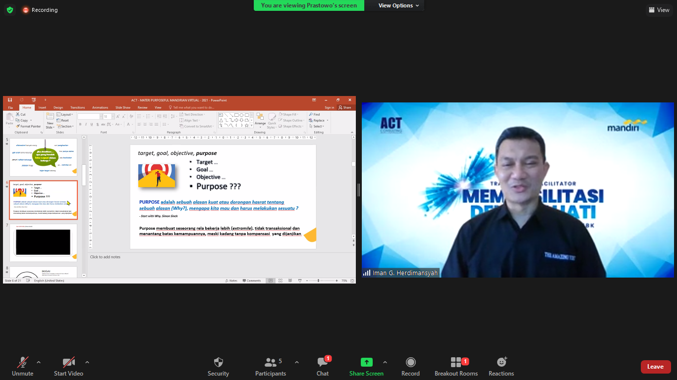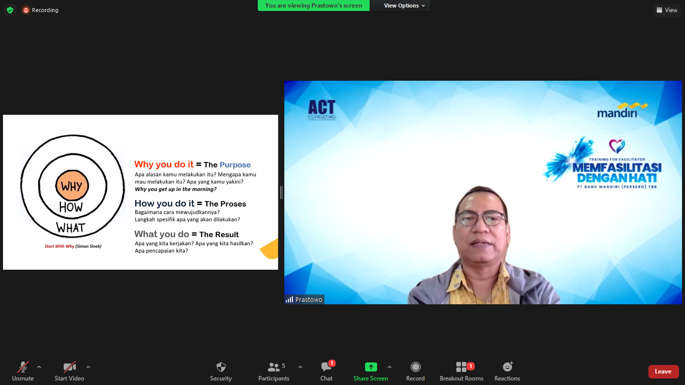 Ia pun akan bertanya hal yang sama kepada timnya saat sesi diskusi dalam Training for Fasilitator dengan tema Memfasilitasi dari Hati di Mandiri University Group yang diikuti oleh senior Fasilitator sebanyak 20 orang Tanggal 29-31 Maret 2021.