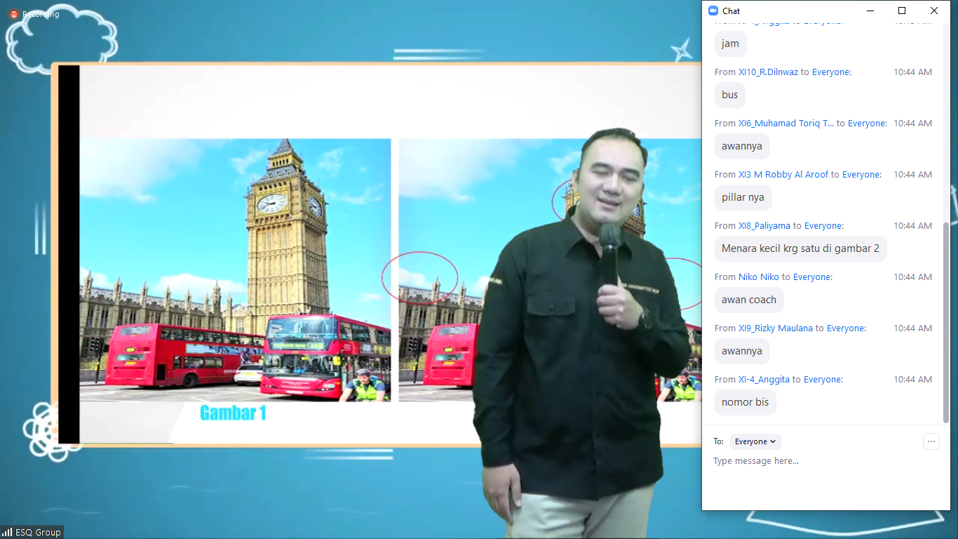Satu per satu siswa menjawab dengan tepat di kolom chat zoom. Mereka sangat teliti dan cepat dalam menjawab pertanyaan dari sang trainer.