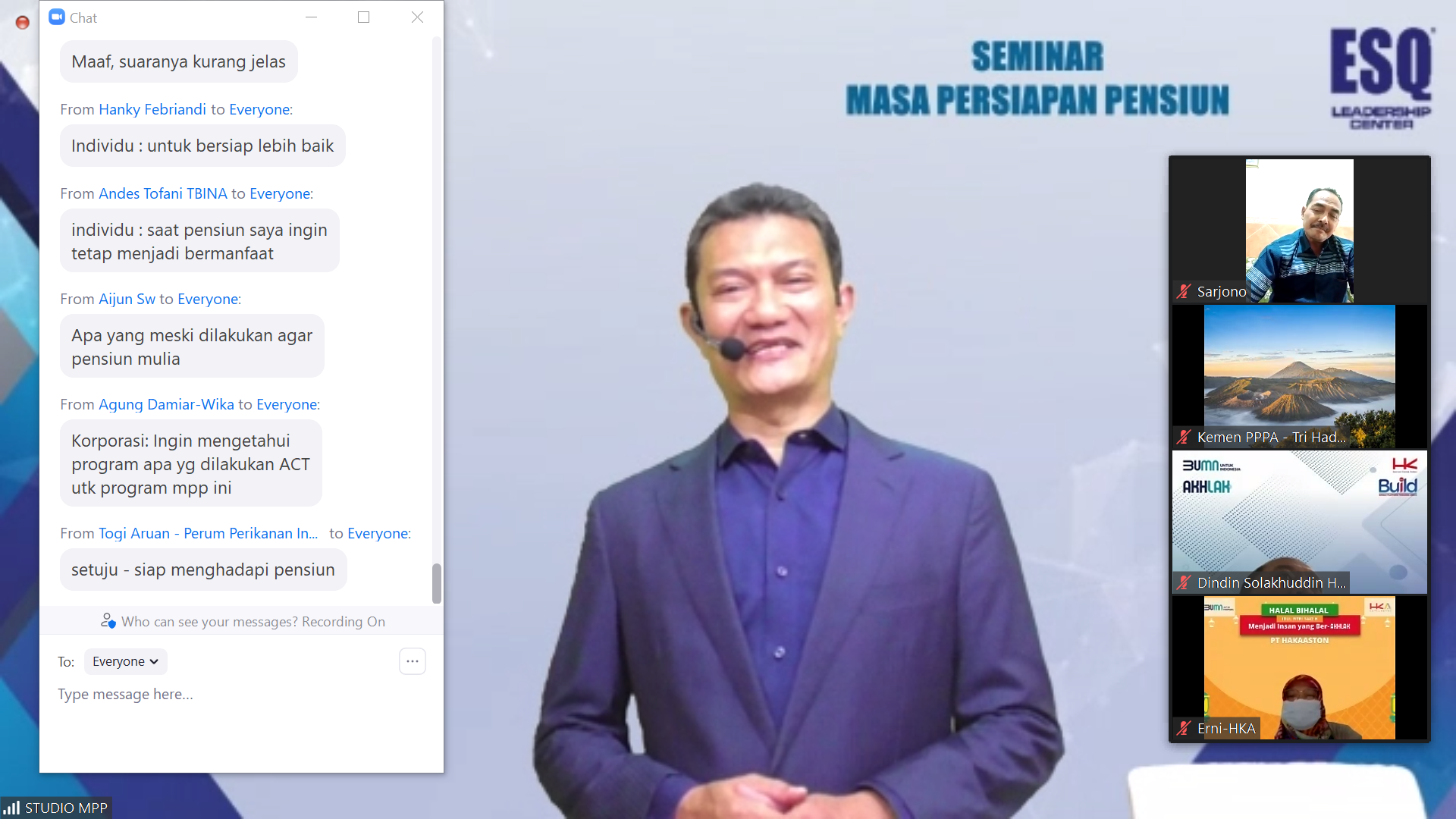 “Kami berpandangan bahwa solusi ini harus diberikan integrative. Insya Allah, semua yang dikhawatirkan itu kita handle. MPP menawarkan total solution yang kami istilahkan 4 modul utama MPP yaitu financial quotient (pembekalan mengenai keuangan), healthy session (rahasia tetap sehat ketika pensiun, leveraging assets (menumbuhkan asset), wisdom living (spiritual mindset),” papar Iman sambil menujukkan sebuah gambar di layar zoom.