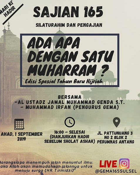 Bertempat di salah satu kediaman anggota komunitas di Jl. Pattunuang 3 No.2 Blok 2 Perumnas Antang, Makassar, Sulawesi Selatan, Silaturahim dan Pengajian 165 (Sajian 165) digelar dengan tausiyah Edisi Spesial Tahun Baru Hijriah 1441H bersama Al Ustadz Jamal Muhammad Genda S.T. dengan tema “Ada Apa Dengan Satu Muharram?”