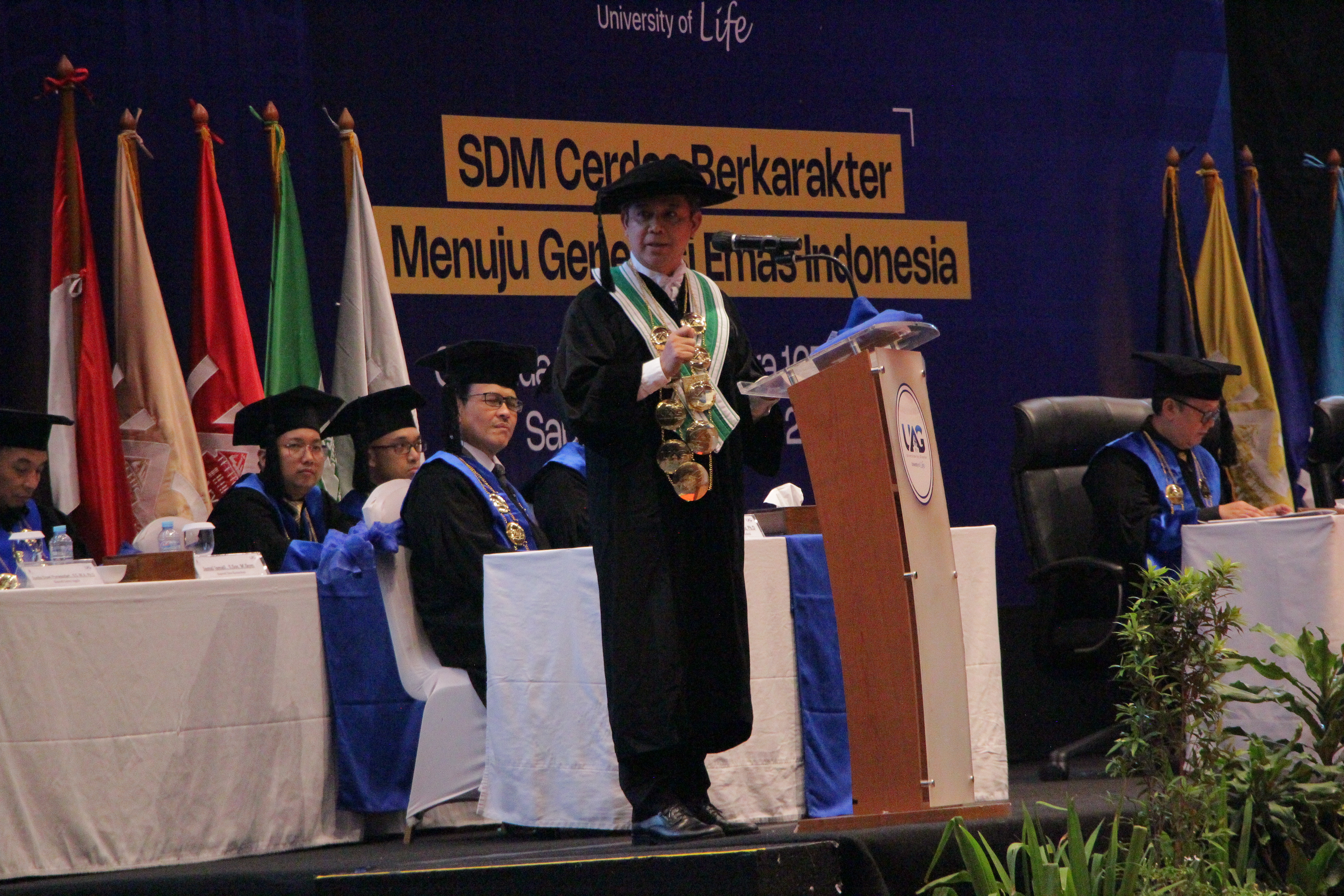 Sementara itu Kepala Lembaga Layanan Pendidikan Tinggi (LLDikti) Wilayah III Prof. Dr. Toni Toharudin, S.Si., M.Sc memberikan sambutan secara online dengan mengharapkan UAG bisa membantu mewujudkan Sarjana Generasi Emas yang unggul dan seimbang dalam kecerdasan intelektual, emosional, dan spiritual demi terciptanya Indonesia Emas 2045.