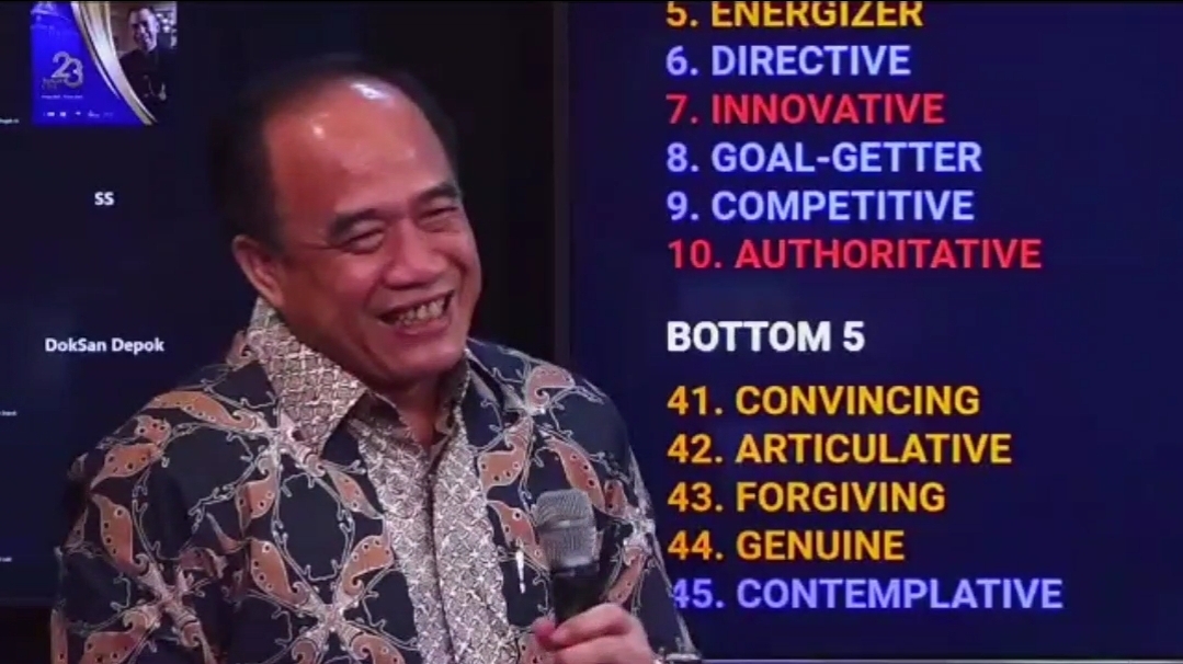 "Top 10 Pak Ade adalah Logical, Collector, Focused, Noble, Energizer, Directive, Innovative, Goal-Getter, Competitive, Authoritative. sedangkan Bottom 5 nya adalah Convincing, Articulative, Forgiving, Genuine, Comtemplative.