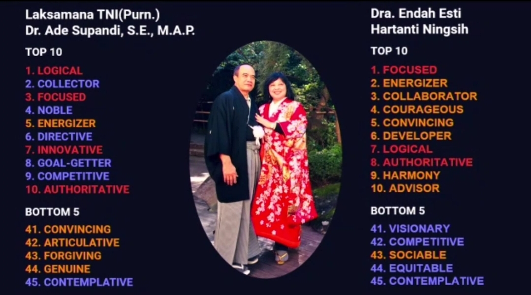 Sedangkan sang istri punya top 10 Focused, Energizer, Collaborator, Courageous, Convincing, Developer, Logical, Authoritative, Harmony, Advisor. bottom 5 nya Visionary, Competitive, Sociable, Equitable, Contemplative," papar Syaiful.