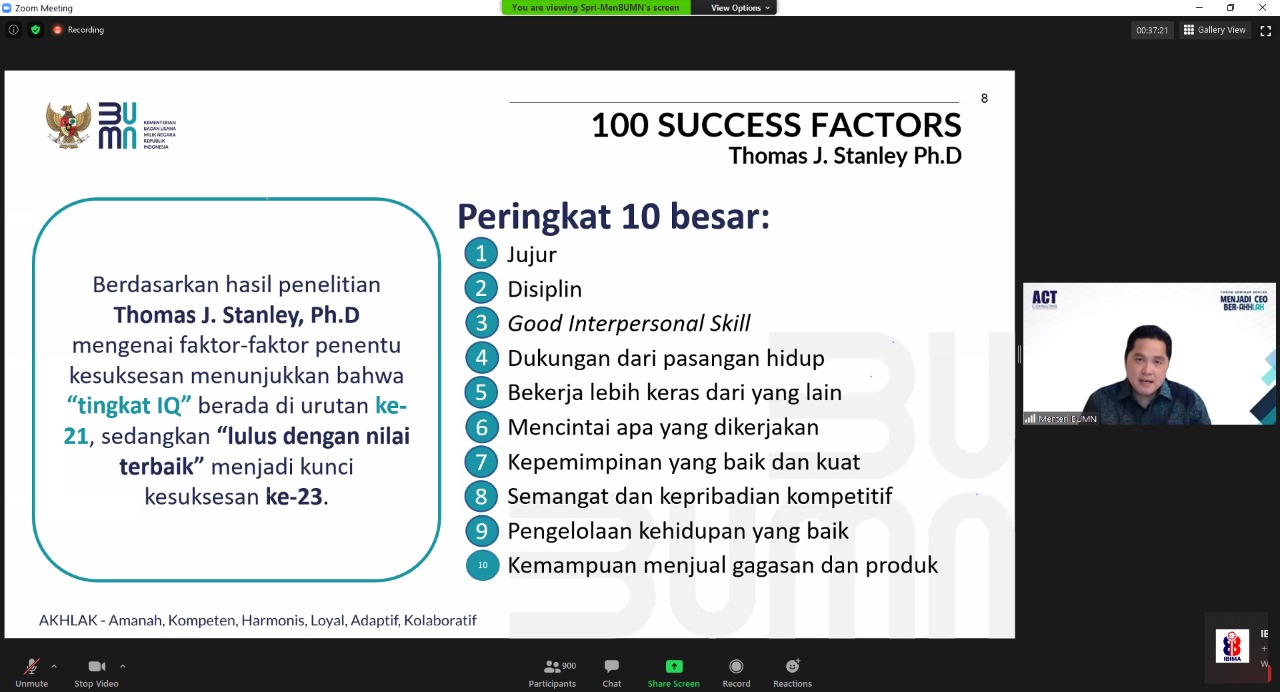 Erick Thohir membagikan slide pertamanya yang berisi tentang hasil riset dari Thomas J. Stanley Ph. D mengenai 100 success factors, yakni mengenai faktor-faktor penentu kesuksesan yang menunjukkan bahwa ‘Tingkat IQ’ berada di urutan ke-21, sedangkan ‘lulus dengan nilai terbaik’ menjadi kunci kesuksesan ke-23. Lalu peringkat 1-nya apa?