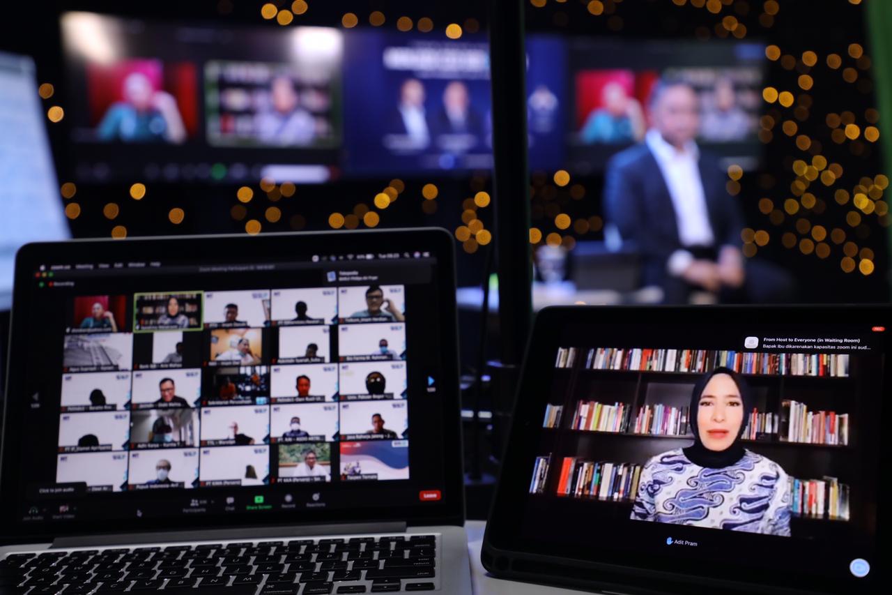 Terlihat dari link zoom Studio ACT Consulting lantai 23 Menara 165, ada sekitar 1,800 lebih peserta yang hadir. Sandrina Malakiano dan Rendy Yusran berkesempatan untuk memandu Narasumber, Direksi dari 203 BUMN, 89 Anak perusahaan BUMN termasuk juga swasta sekitar 30 orang.
