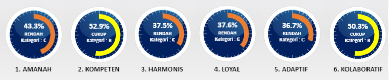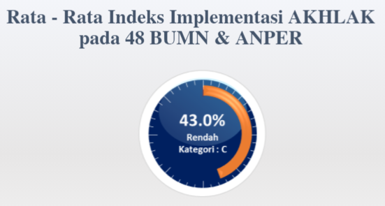 Hasil yang didapatkan dari Rata-rata indeks Implementasi AKHLAK di BUMN dan Anper ternyata cukup rendah (43.0%). Nilai tersebut berada di kategori C, artinya pegawai kadang-kadang mengimplementasikan AKHLAK dalam perilaku kerja sehari-hari.