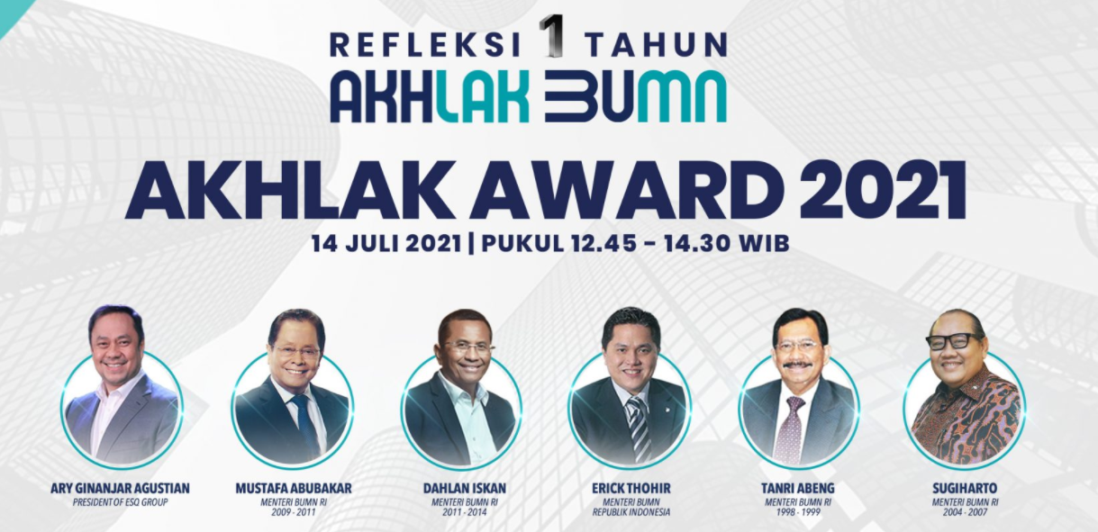 Setelah 1 tahun AKHLAK digulirkan, maka pada 14 Juli 2021 akan dilaksanakan AKHLAK Award untuk BUMN yang sudah melakukan pengukuran dan program Implementasi AKHLAK. Kegiatan ini sangat spesial karena akan dihadiri 4 mantan BUMN dan akan dibuka oleh Meneg BUMN Erick Thohir. Keempat mantan Menteri tersebut yaitu Mustafa Abubakar, Dahlan Iskan, Tanri Abeng, dan Sugiharto. Hal ini merupakan bentuk dukungan dan dan komitmen atas implementasi AKHLAK dalam budaya kerja di BUMN.