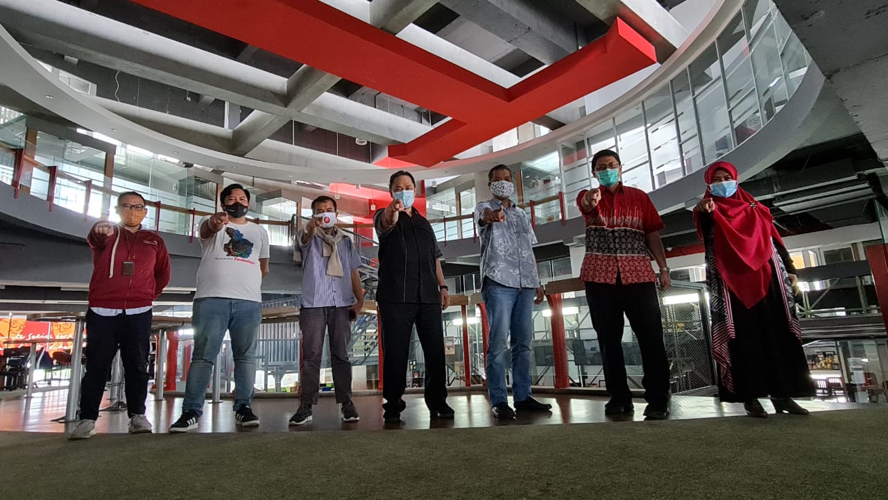 Setelah berbincang santai dan menikmati hidangan, Budi bersama tim mengajak Ary untuk foto bersama dengan background huruf T berwarna merah. Nampak dari foto tersebut kedua tim terlihat kompak dan bersinergi.