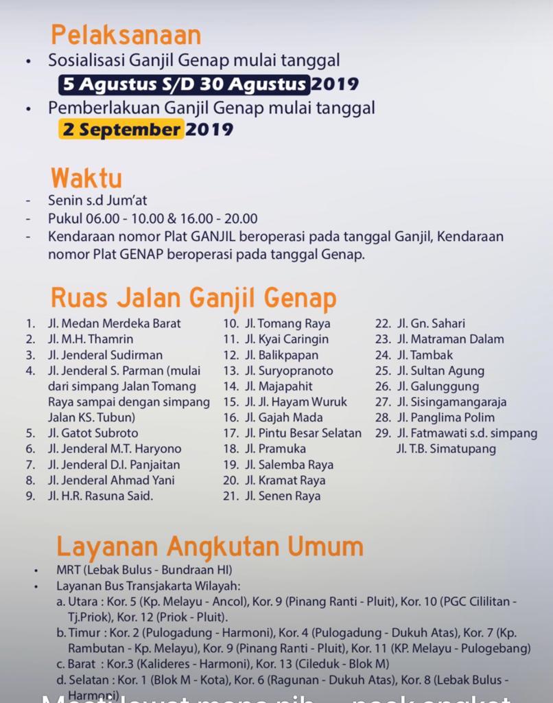 Biasanya sistem ganjil genap berlaku untuk kendaraan beroda empat atau lebih. Namun mulai tanggal 5-30 Agustus 2019, ditetapkan adanya pelaksanaan sosialisasi ganjil genap pada kendaraan beroda dua.