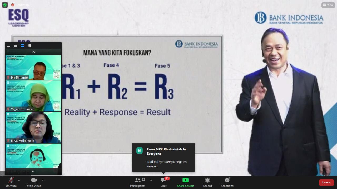 ESQNews.id, JAKARTA - Bank Indonesia (BI) gandeng ESQ Masa Persiapan Pensiun (MPP) seharian penuh pada Senin (29/3/2021) melalui zoom meeting, dengan tema spiritual and wellness.