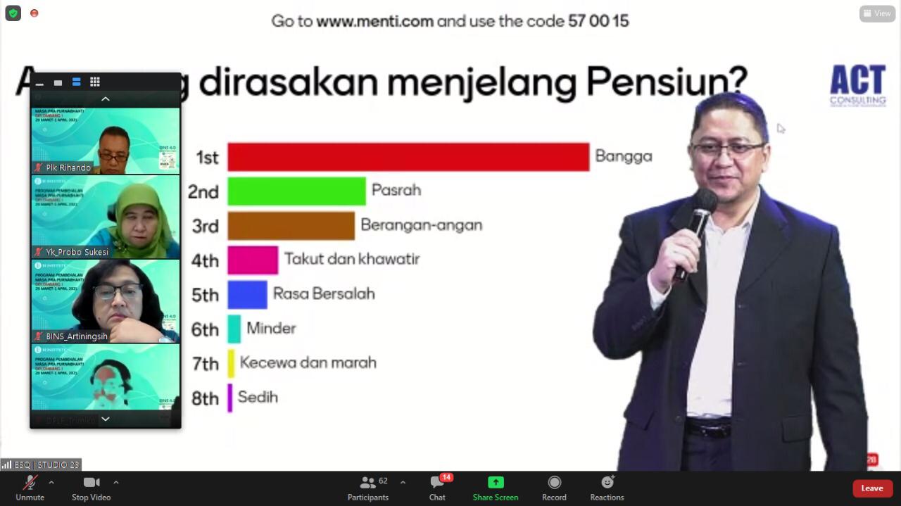 "Saya ada pertanyaan, apa yang dirasakan bapak dan ibu ketika pensiunan itu tiba? Silakan isi di link yang tertera di layar," kata Rinaldy mengarahkan pesertanya.