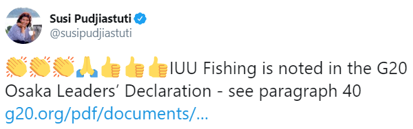 Dan informasi mengenai IUU Fishing ini datang dari akun Twitter Menteri Kelautan dan Perikanan @susipudjiastuti. Susi Pudjiastuti membuat suatu postingan pada (29/6) yang intinya mengenai IUU Fishing sudah dicatat dalam Deklarasi Pemimpin G20 Osaka.