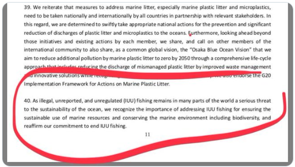 Di sana tertulis paragraph 40, inti isi paragrapnya yaitu “Karena penangkapan ikan ilegal, tidak dilaporkan, dan tidak diatur (IUU) tetap ada di banyak bagian dunia, merupakan ancaman serius bagi kelestarian lautan, kami menyadari pentingnya menangani penangkapan ikan IUU untuk memastikan pemanfaatan berkelanjutan sumber daya laut dan melestarikan lingkungan laut termasuk keanekaragaman hayati, dan menegaskan kembali komitmen kami untuk mengakhiri penangkapan ikan IUU”.