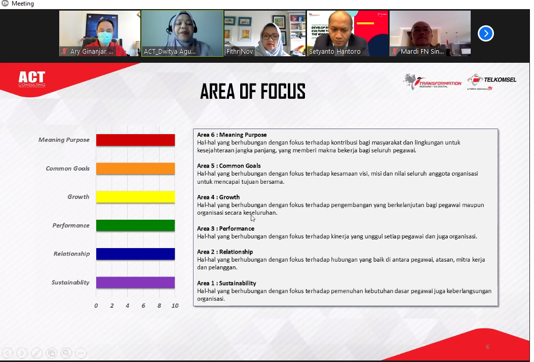 Oleh karena itu, Dwitya beserta tim ACT Consulting berfokus kepada 6 area untuk melihat budaya organisasi di Telkomsel di antaranya dari segi Sustainability, Relationship, Performance, Growth, Common Goals, Meaning Purpose.