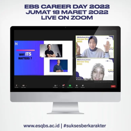 ESQNews.id, JAKARTA - Pada hari Jumat (18/03) ESQ Business School menyelenggarakan kegiatan "EBS Career Day 2022" yang diselenggarakan melalui aplikasi zoom meeting.