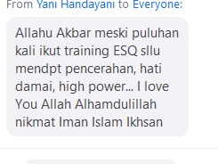 Adapun testimoni dari peserta lainnya, yaitu seorang wanita yang mengikuti training ESQ kembali setelah 8 tahun ‘off’.