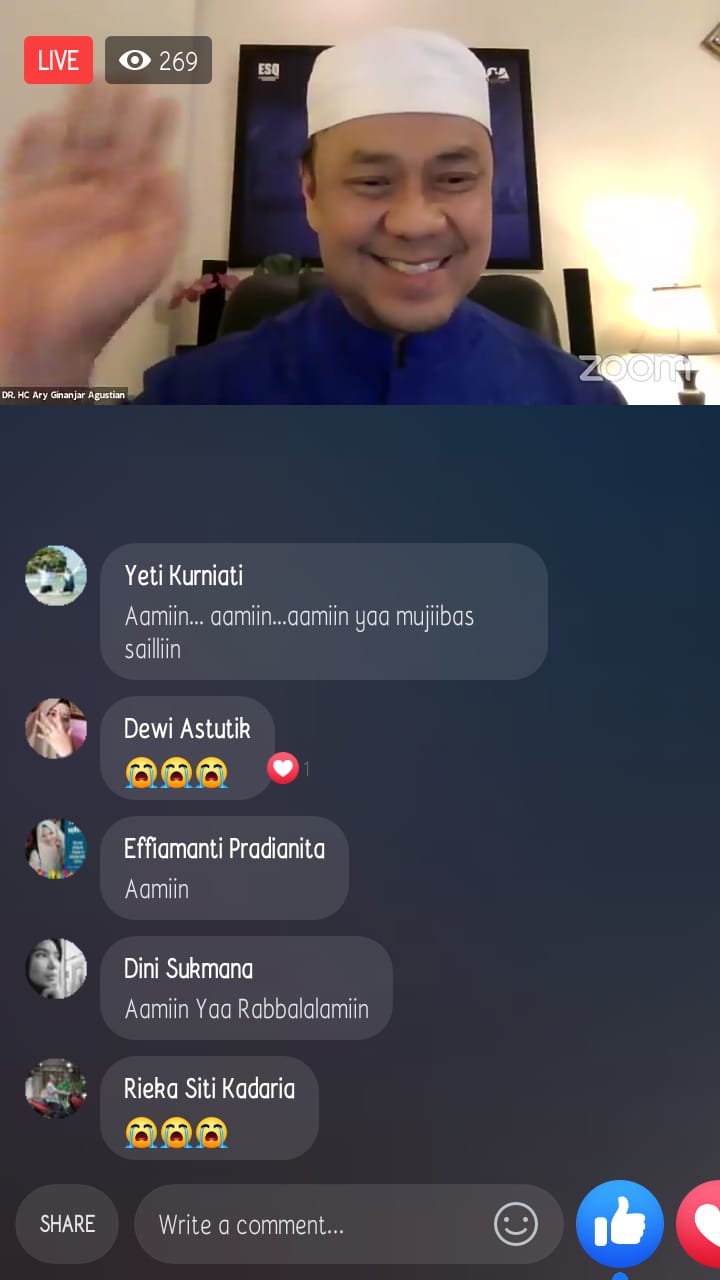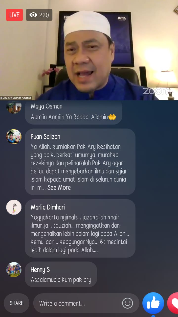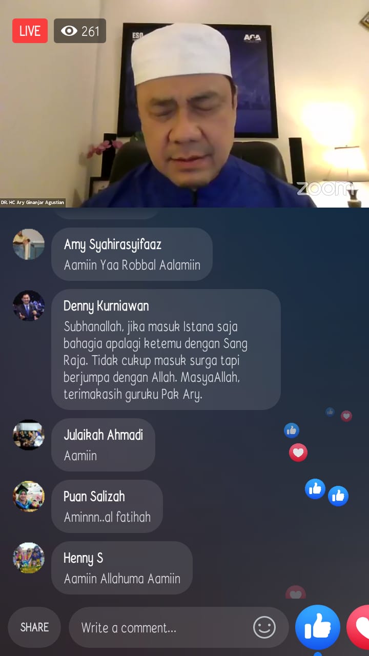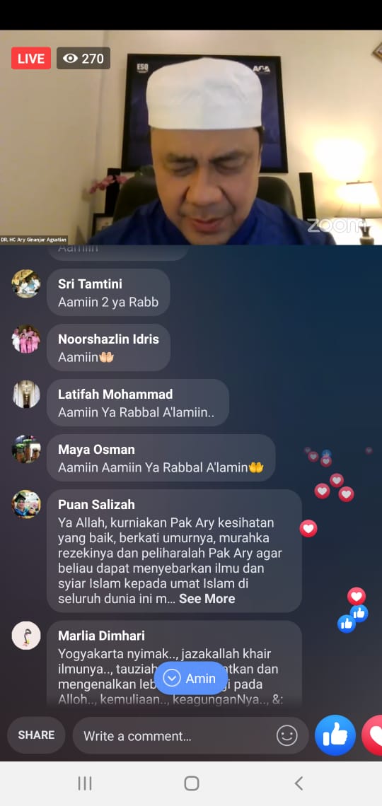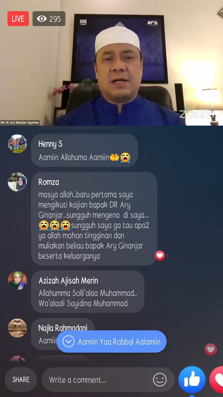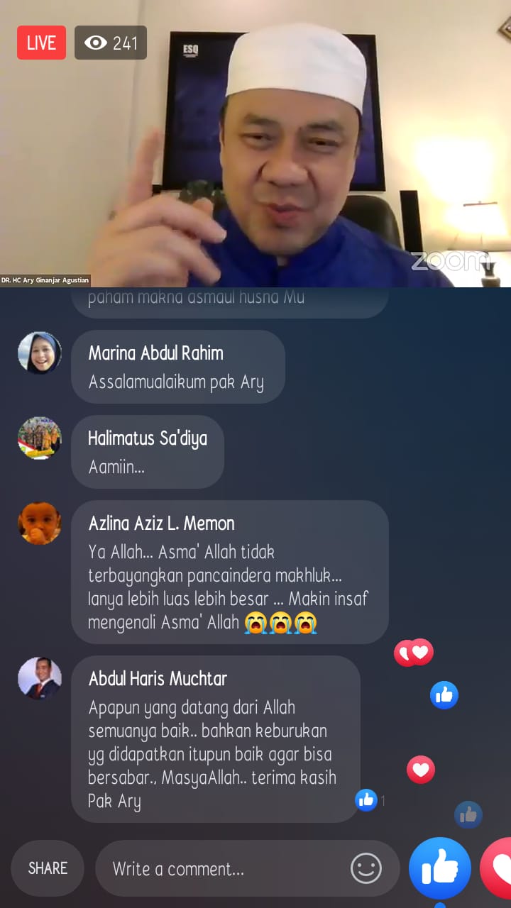 ESQNews.id, JAKARTA - Pada Rabu (11/11/2020) pukul 05.20- 06.30 WIB sekitar 1.300 orang mengikuti Kajian Asmaul Husna Live by Zoom dan Facebook, bersama Dr. (H.C) Ary Ginanjar Agustian, CEO ESQ Group.