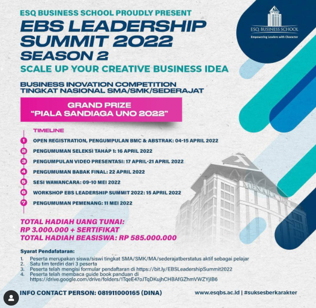 ESQNews.id, JAKARTA - ESQ Business School mengadakan EBS Leadership Summit 2022 Season 2 yang bertemakan "Scale up Your Creative Business Idea." Di sinilah ajang bagi para siswa/siswi SMA/SMK/Sederajat untuk melahirkan ide-ide bisnis dan produk-produk yang kreatif yang nantinya akan memperebutkan Grand Prize yaitu "Piala Sandiaga Uno 2022." Beasiswa dari ESQ Business School senilai total 585 Juta Rupiah!