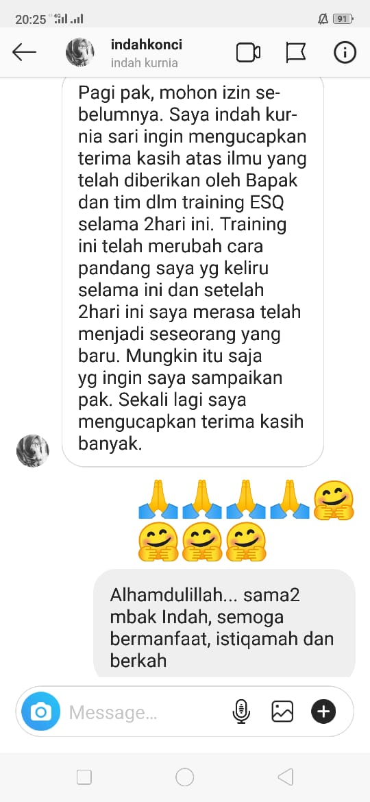 Saya berharap banyak teman-teman bisa ikut training-training ESQ. Kenapa? karena dengan mengikuti training ESQ kita bisa menjadi pribadi yang lebih baik dan belajar terus maju,” ucapnya.