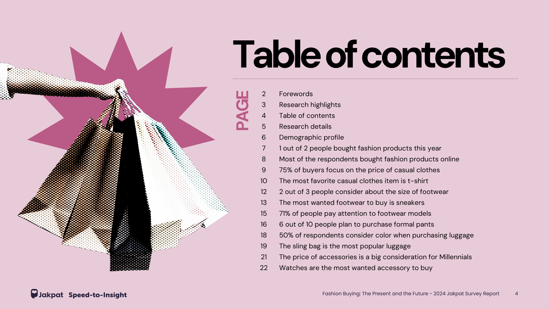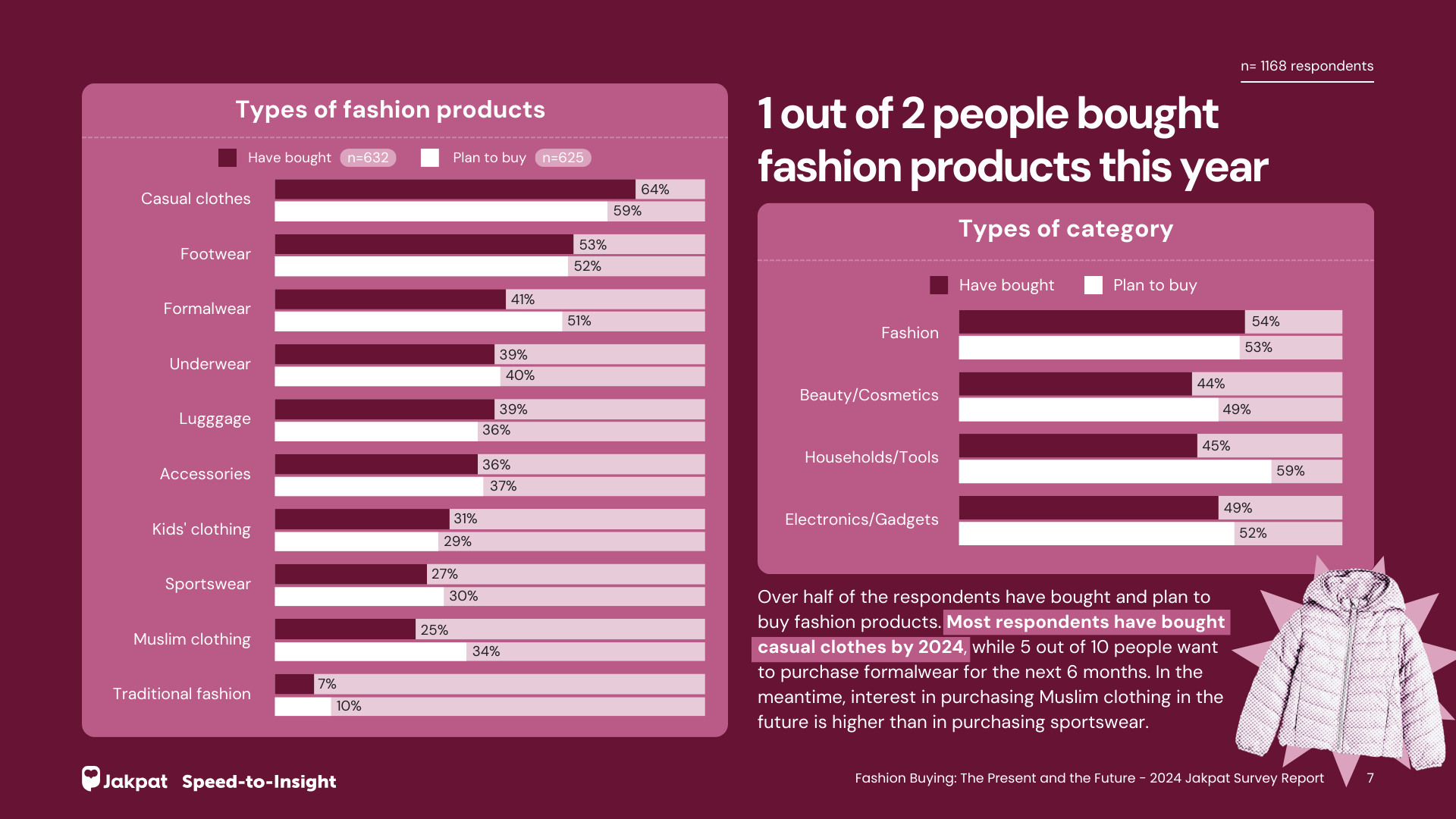 Hasil survei menunjukkan bahwa 54% responden membeli produk fesyen tahun ini dengan mayoritas membeli pakaian kasual. Sementara, 53% responden berencana membeli produk fesyen dimana 5 dari 10 orang ingin membeli pakaian formal untuk 6 bulan ke depan.