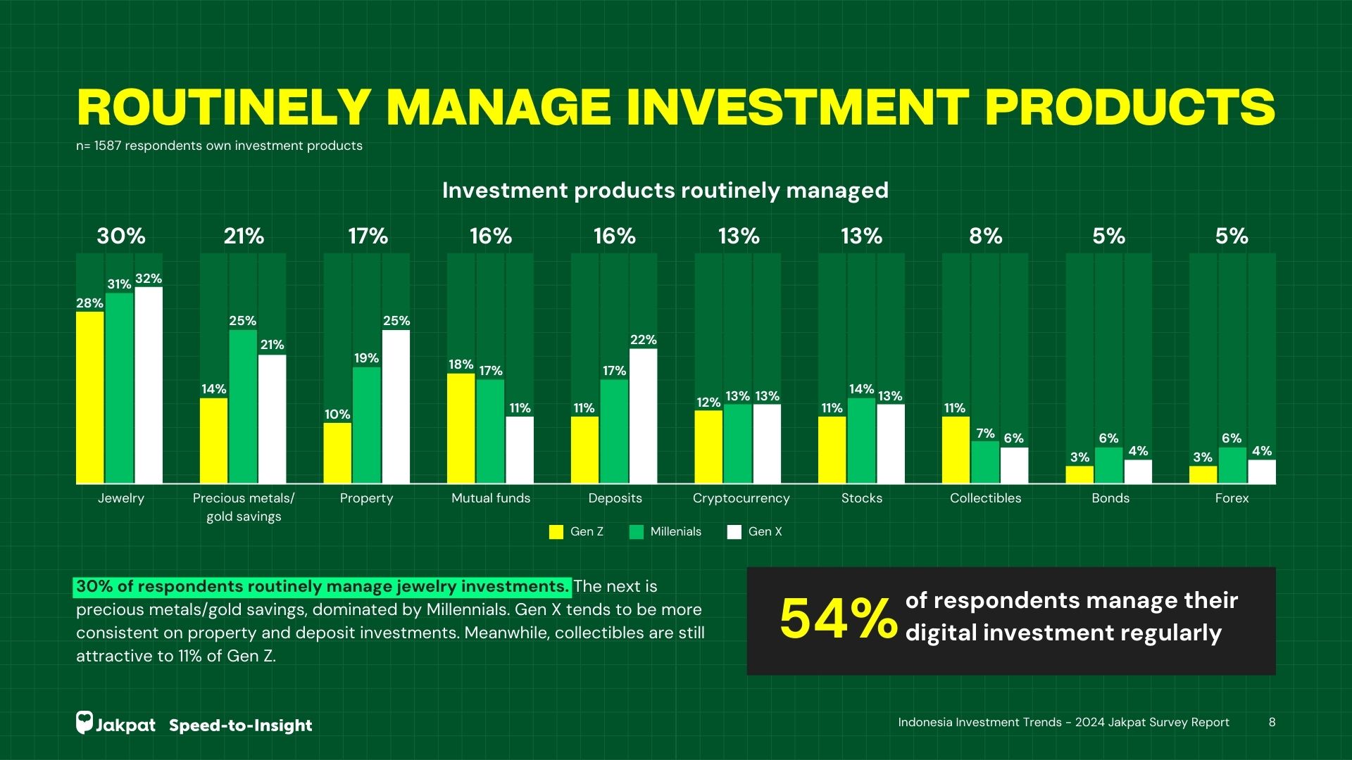 Hasil survei menunjukkan bahwa 3 dari 4 orang pernah memiliki investasi. Lebih detail, 83% dari pemilik ini mengelola produk investasi mereka secara rutin dengan perhiasan sebagai produk yang paling banyak dikelola dengan persentase 30%.
